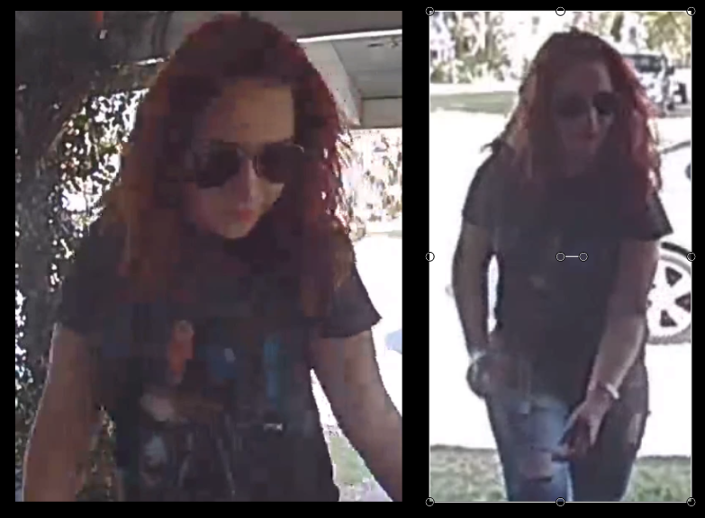 The woman appears to be white (possibly Hispanic) with red hair. The vehicle she arrived and left in appears to be a light gold or light silver sedan.
